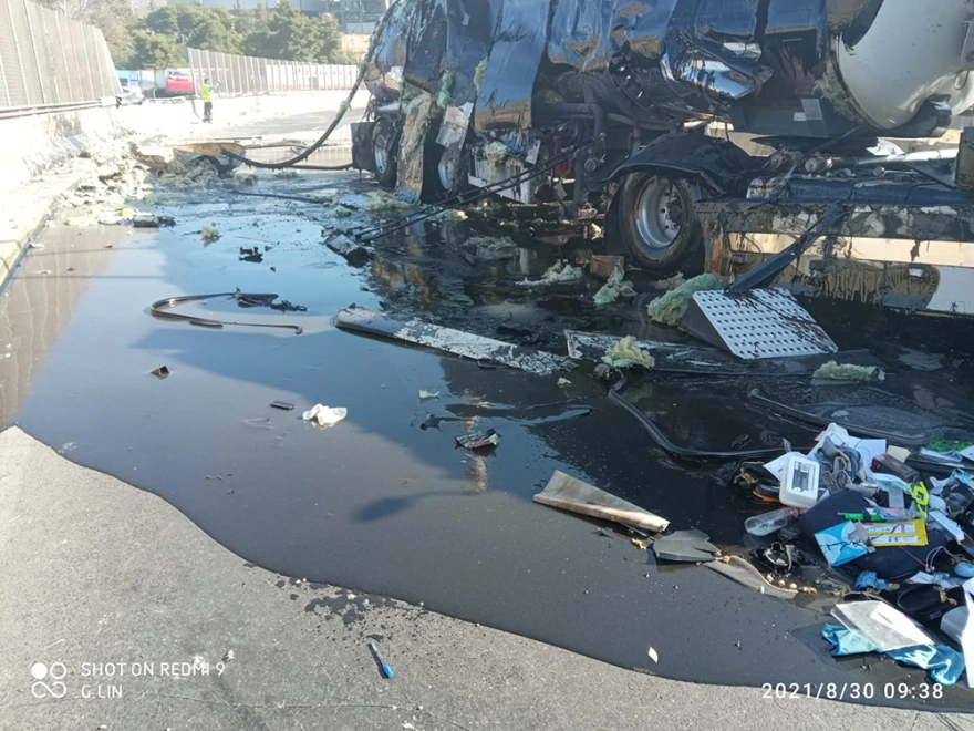 Λόγω της ανατροπής του οχήματος το οδόστρωμα έχει γεμίσει με καύσιμα