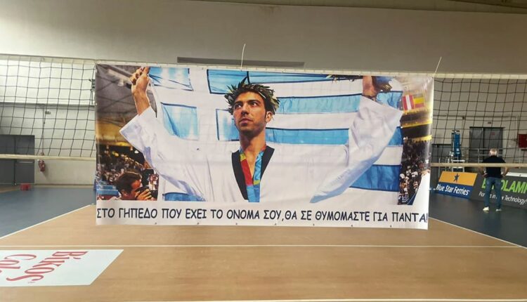 «Στο γήπεδο που έχει το όνομά σου θα σε θυμόμαστε για πάντα», γράφει σε ένα μεγάλο πανό που έχουν κρεμάσει στο φιλέ του βόλεϊ και έχει τη φωτογραφία του ολυμπιονίκη με το δάφνινο στεφάνι στο κεφάλι και την ελληνική σημαία.