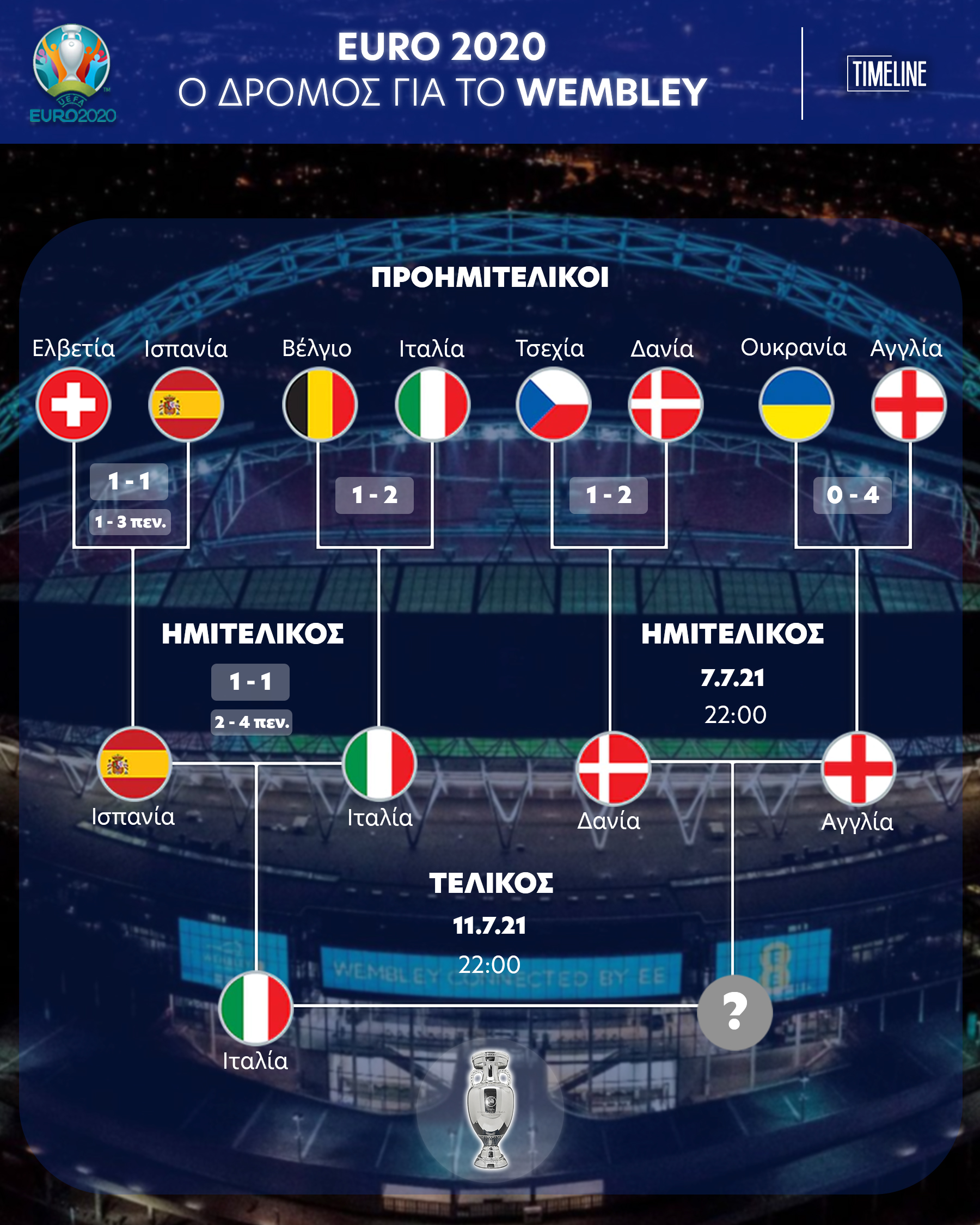 Η Ιταλία είναι από τα ξημερώματα της Τετάρτης η πρώτη φιναλίστ του τελικού του Euro 2020. Απόψε (7/07, 22:00) και πάλι στο «Γουέμπλεϊ» η σκουάντρα ατζούρα» θα μάθει τον αντίπαλό της στον καταληκτικό αγώνα της διοργάνωσης.