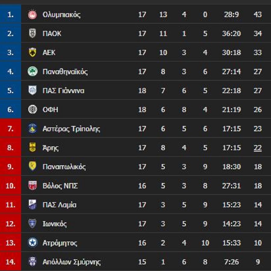 Από την άλλη, η ομάδα του Ιβάν Γιοβάνοβιτς βρίσκεται στην 4η θέση του βαθμολογικού πίνακα, με 27 βαθμούς, έχοντας συγκάτοικο τον ΠΑΣ Γιάννινα, άλλα και με ένα παιχνίδι λιγότερο από τους Ηπειρώτες.