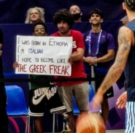 Σύμφωνα με όσα έγραφε στο χάρτινο πλακάτ ο νεαρός, που έχει και προσθετικό μέλος καθώς έχει ακρωτηριασμένο το αριστερό του πόδι, γεννήθηκε στην Αιθιοπία και ζει πλέον στην Ιταλία, τονίζοντας ότι «είναι Ιταλός» και ελπίζει να γίνει σαν τον Γιάννη Αντετοκούνμπο.