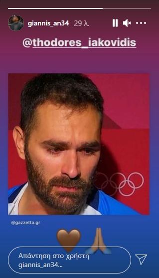Ο “Greek Freak” πόσταρε τη φωτογραφία του δακρυσμένου Ιακωβίδη και πρόσθεσε μία καρδιά και μια προσευχή για τον Θοδωρή Ιακωβίδη, ο οποίος και εξήγησε τις δυσκολίες που τον αναγκάζουν να βάλει πρόωρο τέλος στην καριέρα του στην άρση βαρών.