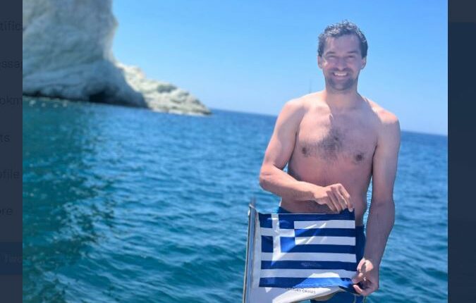 «Ευχαριστώ Σαντορίνη» ήταν το μήνυμά του στα ελληνικά, ποζάροντας μαζί με την ελληνική σημαία.