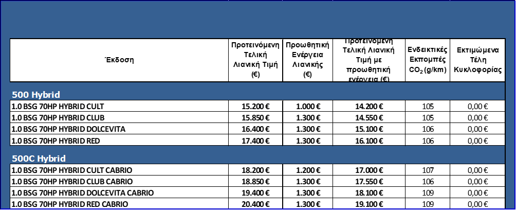 Πέρα από το σημαντικά χαμηλότερο κόστος χρήσης που εξασφαλίζει το υβριδικό σύστημα, η σειρά του 500 Hybrid, η οποία περιλαμβάνει εκδόσεις hatchback και Cabrio, απολαμβάνει και επιπλέον έκπτωσης από 1.000 έως και 1.300 ευρώ στην τιμή αγοράς, καθιστώντας ακόμα πιο προσιτή την απόκτησή του μοντέλου.