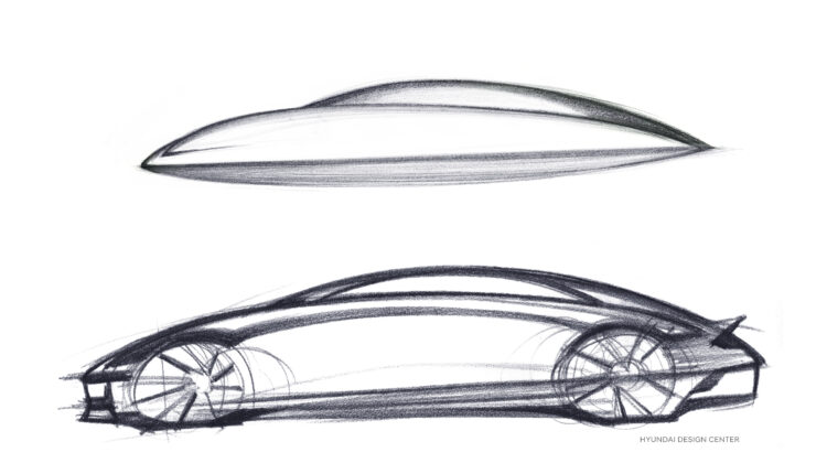 Η σχεδιαστική γραμμή που εμφανίζεται στο σκίτσο αντικατοπτρίζει τη δέσμευση των σχεδιαστών της Hyundai να ικανοποιούν τόσο τις αισθητικές όσο και τις λειτουργικές ανάγκες των πελατών στην εποχή της ηλεκτροκίνησης.