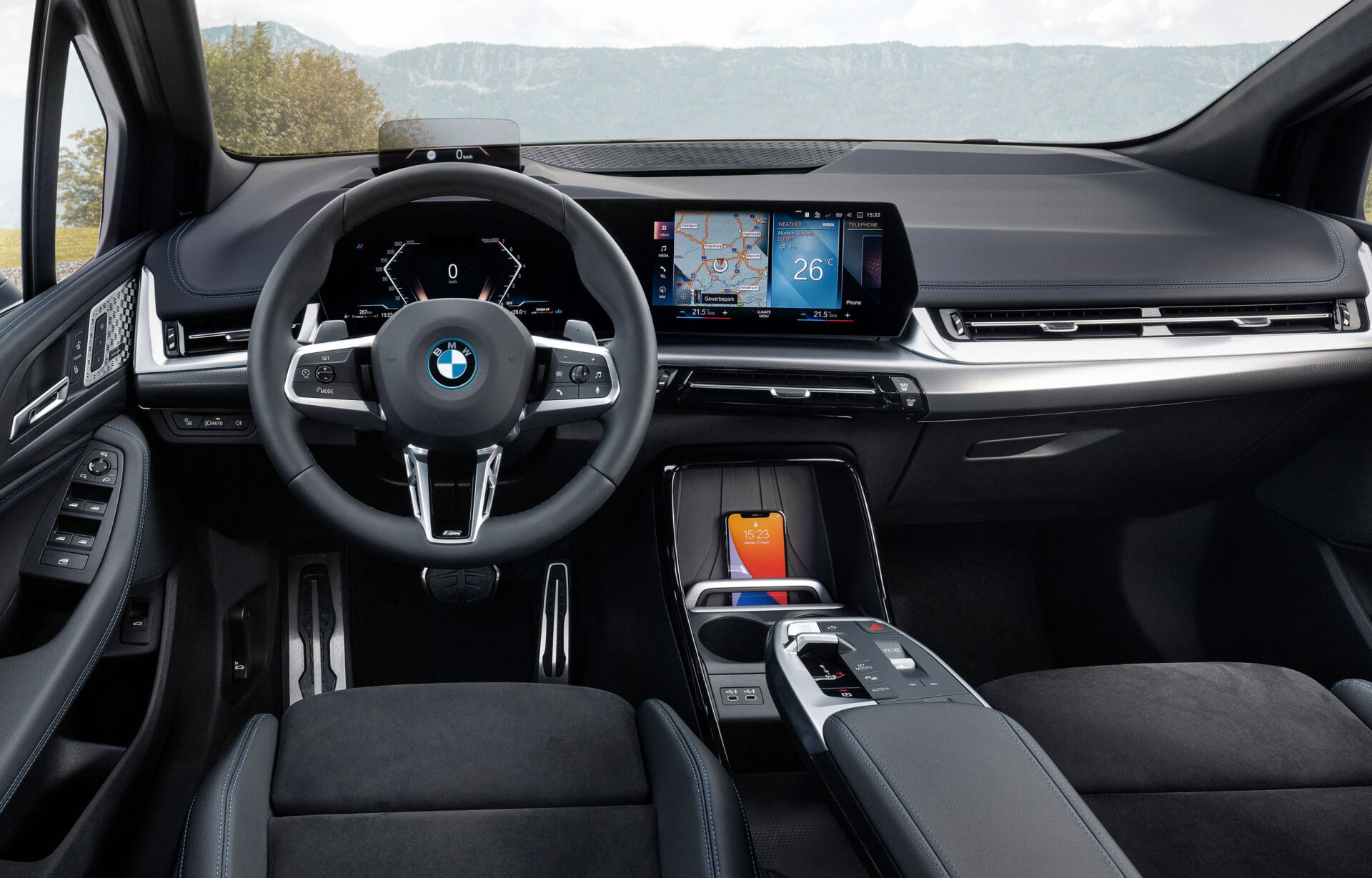 Ανάλογα με την έκδοση, ζάντες αλουμινίου 16” ή 17” τοποθετούνται στάνταρ. Αλουμινένιες ζάντες έως 19” διατίθενται προαιρετικά. Οι ενδιαφερόμενοι, μπορούν επίσης να παραγγείλουν τη νέα BMW Σειρά 2 Active Tourer σε έκδοση Luxury Line ή με M Σπορ πακέτο εξοπλισμού εναλλακτικά, αντί της βασικής έκδοσης. Δύο απλά και εννέα μεταλλικά χρώματα διατίθενται για το εξωτερικό. Το μέγεθος και η ευελιξία εσωτερικού της νέας BMW Σειράς 2 Active Tourer τονίζονται από την ολική επανασχεδίαση του μοντέλου δεύτερης γενιάς. Η γεωμετρία της καμπίνας και οι πολυάριθμες λεπτομέρειες είναι εμπνευσμένες από τη φιλοσοφία της τεχνολογικής ναυαρχίδας BMW iX. Αυτή δημιουργεί ένα περιβάλλον προηγμένης πολυτέλειας, όπου κυριαρχούν ο slim πίνακας οργάνων, η κυρτή οθόνη BMW Curved Display και το “αιωρούμενο” υποβραχιόνιο με το ενσωματωμένο πάνελ ελέγχου, ενώ εμφανής είναι η μείωση του αριθμού φυσικών χειριστηρίων και διακοπτών σε όλη την καμπίνα.
