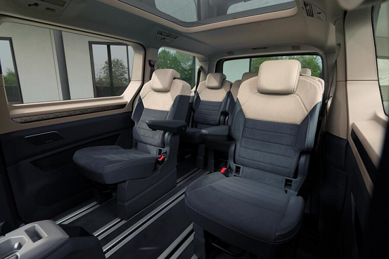 Το επίπεδο δάπεδο διαθέτει έξι συνολικά στιβαρές ράγες. Πάνω σε αυτές τοποθετούνται τα καθίσματα και το πολυχρηστικό τραπεζάκι. Οι πολλές δυνατότητες διαμόρφωσης κάνουν τον εσωτερικό χώρο ευέλικτο και προσαρμόσιμο στην εκάστοτε ανάγκη κίνησης. Ένα ακόμα ενδιαφέρον στοιχείο είναι ότι το πολυχρηστικό τραπεζάκι μπορεί να μετακινηθεί μέσα στον χώρο των επιβατών, να πάρει διάφορες μορφές και να γίνει ακόμα και κεντρική κονσόλα ανάμεσα στα καθίσματα του οδηγού και του συνοδηγού (Βασικός εξοπλισμός στο Multivan Life και Style). Στο πίσω μέρος, τα καθίσματα είναι εξοπλισμένα με θύρες USB Type C.