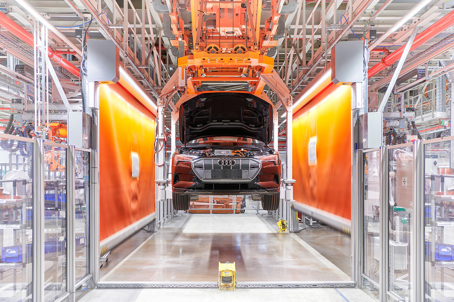 Η ξενάγηση μεταφέρει τους θεατές στον κόσμο της παραγωγής του e-tron – από τις πρέσες στο βαφείο, μέχρι την τελική συναρμολόγηση. Για παράδειγμα, στην κατασκευή αμαξωμάτων, παρουσιάζεται ο τρόπος με τον οποίο άνθρωποι και ρομπότ συνεργάζονται αρμονικά, επιτυγχάνοντας τις τέλειες συγκολλήσεις. Στην τελική συναρμολόγηση, οι επισκέπτες μέσω streaming μπορούν να δουν πώς συναρμολογούνται πάνω από 1.000 εξαρτήματα σε έναν ταινιόδρομο μήκους άνω του ενός χιλιομέτρου. Λίγο πριν το τέλος, μία γρήγορη ματιά στο τμήμα κατασκευής μπαταριών υψηλής τάσης, με έλεγχο σε στεγανώσεις, ηλεκτρικές λειτουργίες και, φυσικά, την ισχύ κάθε μπαταρίας ενώ ακολουθεί παρουσίαση της διαδικασίας σύνδεσης του ηλεκτρικού κινητήριου συστήματος με την μπαταρία. Η ξενάγηση κλείνει με την τελική δοκιμή ποιότητας, όπου ελέγχονται ξανά όλες οι λειτουργίες και επιβεβαιώνεται η άρτια κατασκευή κάθε αυτοκινήτου.