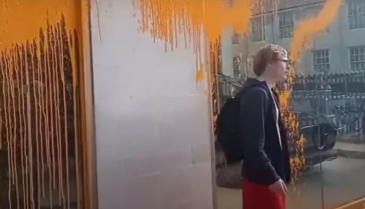 Ακτιβιστές της οργάνωσης απέκλεισαν σήμερα την περιοχή και ψέκασαν με πορτοκαλί μπογιά την γυάλινη πρόσοψη της έκθεσης υπερπολυτελών αυτοκινήτων Αston Martin.