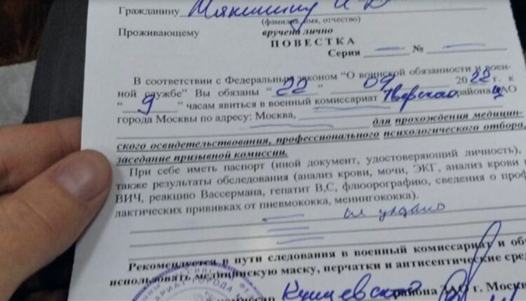 Στα social media, Ρώσοι δημοσιεύουν τα χαρτιά της επιστράτευσης που έχουν λάβει για να παρουσιαστούν. «Νόμος της Ρωσικής Ομοσπονδίας: Σχετικά με το στρατιωτικό καθήκον και τη στρατιωτική θητεία, είστε υποχρεωμένος στις 22 Σεπτεμβρίου να παρουσιαστείτε στο ……. τμήμα της ……. περιφέρειας της Μόσχας στη διεύθυνση ……. για τη διεξαγωγή των απαραίτητων ιατρικών και ψυχομετρικών εξετάσεων και την εξέταση της επιτροπής. Πρέπει να έχετε διαβατήριο, στρατιωτική ταυτότητα, αυτό το χαρτί».