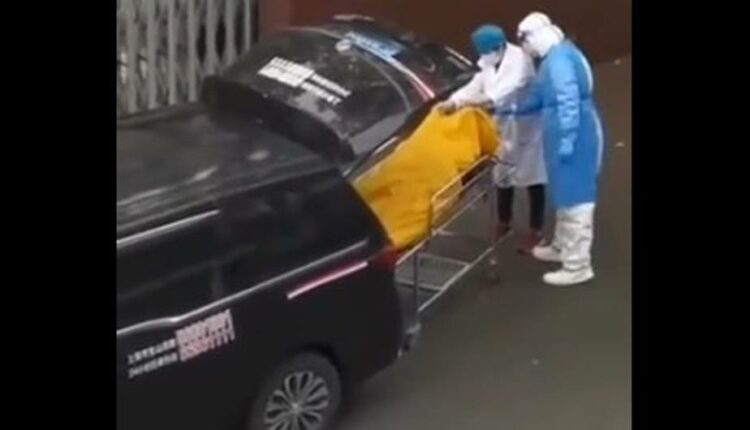 Στα πλάνα φαίνονται εργαζόμενοι που φορούν προστατευτική ενδυμασία να βγάζουν έναν σάκο πτώματος από το φορτηγό του νεκροτομείου σε ένα καροτσάκι.