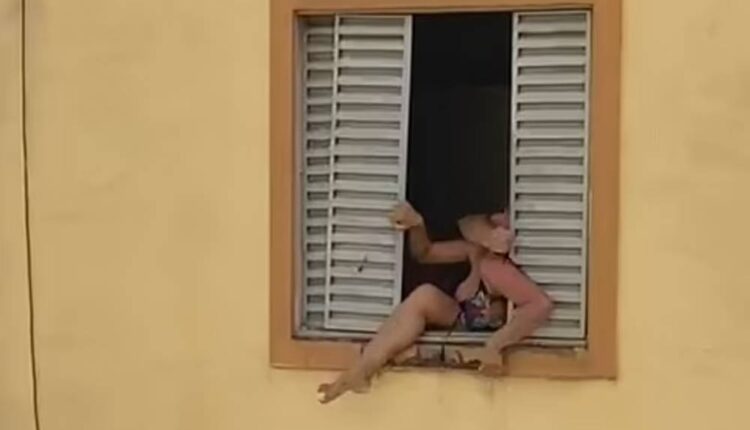 Στο βίντεο που δημοσιεύει η Βρετανική Daily Mail και κατέγραψαν γείτονες στο στο Ντούκε ντε Κάξιας του Ρίο ντε Τζανέιρο, βλέπουμε την 35χρονη Μαρία Χοσέ να βγάζει το πόδι της έξω από το παράθυρο ενώ ο 32χρονος σύζυγός της Βίτορ Μπατίστα την τραβάει μέσα στο διαμέρισμα.