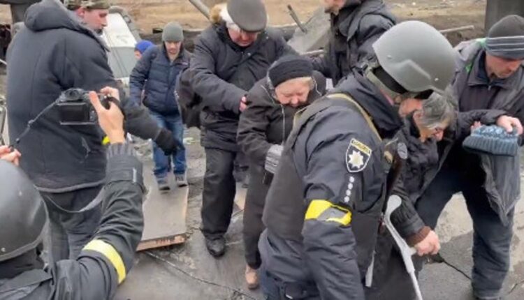An old woman on crutches crosses the Irpin River. Thousands of civilians, many elderly and handicapped, are fleeing shelling and Russian forces in Irpin, a city on the northern outskirts of the capital Kyiv. pic.twitter.com/qRUJxUOzvb
