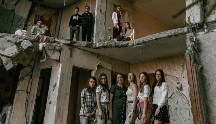 Οπως αυτή των μαθητών και των μαθητριών στο Τσερνίχιβ, που πόζαραν πάνω σε κατεστραμμένα άρματα μάχης, μέσα σε κρατήρα από έκρηξη, μπροστά στα ερείπια που άφησε πίσω του ο πόλεμος στην πόλη τους.