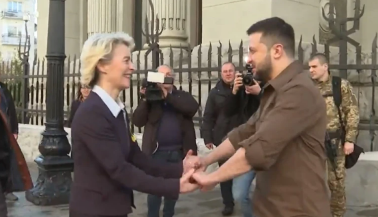 Ο ουκρανός ηγέτης περίμενε την πρόεδρο της Κομισιόν έξω από το κτίριο της προεδρίας. Μαζί της ήταν και ο επικεφαλής της ευρωπαϊκής εξωτερικής πολιτικής, Ζοζέπ Μπορέλ.