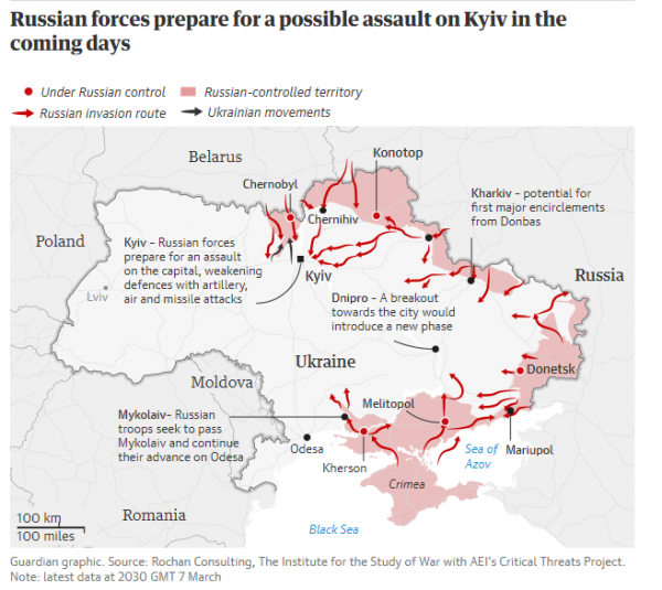 «Τα ρωσικά στρατεύματα πιθανότατα επιχειρούν να παρακάμψουν το Μικολάιβ και να διασχίσουν τον ποταμό Southern Bug της πόλης, για να επιτρέψουν μια προέλαση στην Οδησσό, που θα συνδυαστεί με μια επικείμενη αμφίβια επιχείρηση εναντίον της Οδησσού και θα τους οδηγήσει βόρεια, από την Κριμαία προς την Ζαπορίζια».