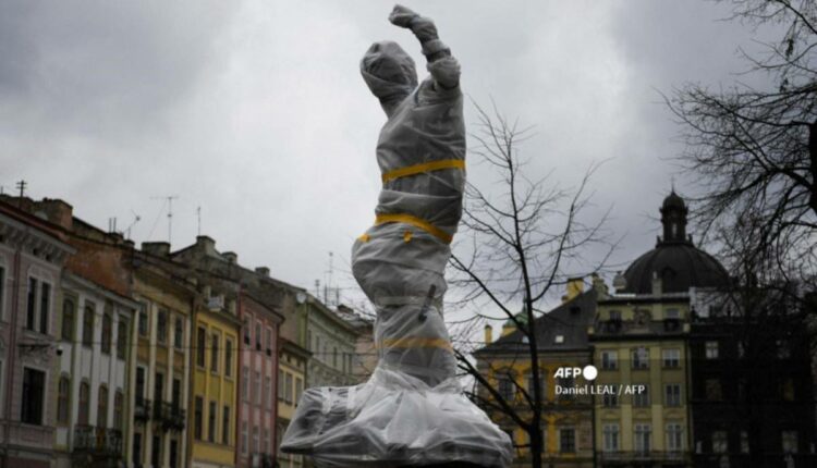 Με αφρώδες και αλεξίπυρο υλικό «ντύνουν» οι πολίτες τα αγάλματα στην ιστορική πόλη Λβιβ, σε μια προσπάθεια προστασίας των πολιτιστικών θησαυρών τους από πιθανό ρωσικό βομβαρδισμό.