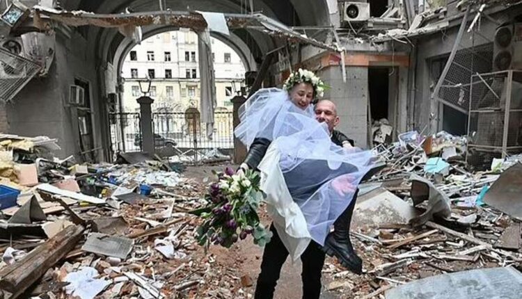 Οι νεόνυμφοι Nastya Gracheva και Anton Sokolov φωτογραφήθηκαν λίγη ώρα μετά τον γάμο τους στα ερείπια ενός κτιριακού συγκροτήματος που στέγαζε γραφεία και καταστήματα, στη δεύτερη μεγαλύτερη πόλη της Ουκρανίας, το Χάρκοβο.