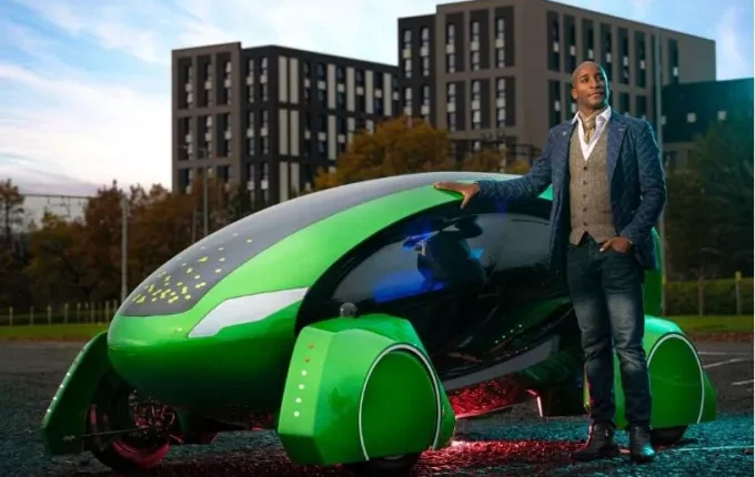Το αυτόνομο, τετράτροχο όχημα κινείται χαμηλά στο έδαφος, διαθέτει αεροδυναμική εμφάνιση, έχει πράσινο και μαύρο χρώμα, μαζί με μια πινακίδα κυκλοφορίας μπροστά και πίσω.