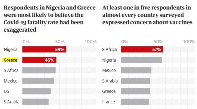 Στην πρώτη θέση βρίσκεται η Νιγηρία όπου σχεδόν το 60% των ερωτηθέντων δήλωσαν ότι ο παραπάνω ισχυρισμός είναι «σίγουρα ή μάλλον αληθινός». Η Ελλάδα βρίσκεται στη δεύτερη θέση με ποσοστό μεγαλύτερο του 40%, ενώ ακολουθούν η Νότια Αφρική, το Μεξικό και οι ΗΠΑ.