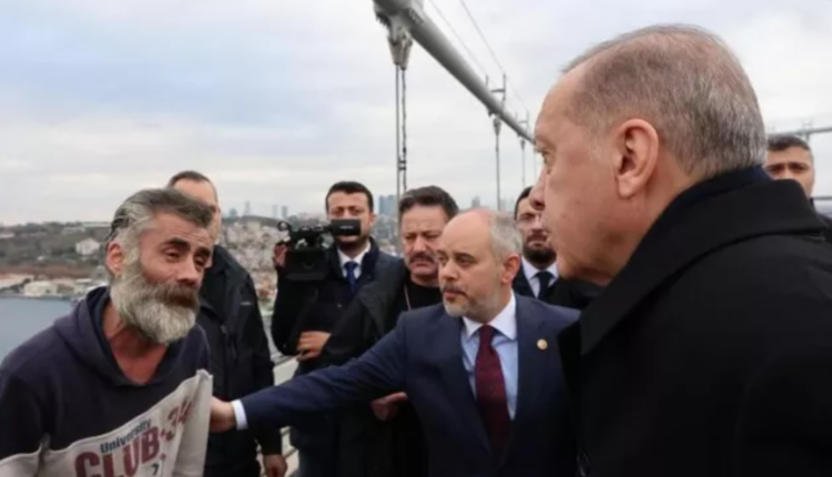 Την Παρασκευή σε μία από τις γέφυρες του Βοσπόρου, σύμφωνα με τα ΜΜΕ της Τουρκίας, καθώς ο Ερντογάν περνούσε με τη συνοδεία του από το σημείο, είδε έναν πολίτη να ετοιμάζεται να πέσει από τη γέφυρα, σταμάτησε το προεδρικό όχημα και πήγε κοντά του, για να τον πείσει να μην πηδήξει.