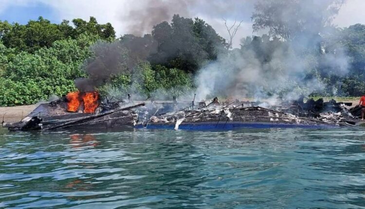 Πυκνός μαύρος καπνός υψωνόταν από το διώροφο σκάφος καθώς οι φλόγες το κατέτρωγαν ολόκληρο, δείχνουν εικόνες που δημοσιοποίησε η ακτοφυλακή.