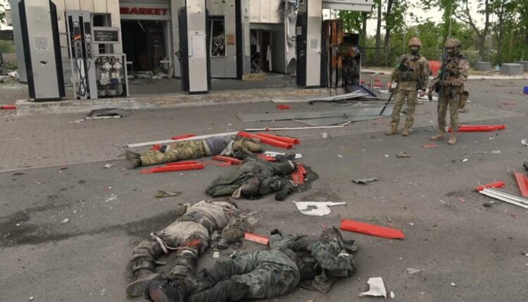 Οι εικόνες προέρχονται από ένα χωριό κοντά στο Χάρκοβο και σύμφωνα με το ειδησεογραφικό πρακτορείο: «Τα σώματα αγνώστων ανδρών, που πιστεύεται ότι είναι Ρώσοι στρατιώτες, τοποθετημένα ώστε να σχηματίζουν το γράμμα Ζ, σύμβολο της ρωσικής εισβολής, βρέθηκαν κοντά σε ένα χωριό που ανακαταλήφθηκε πρόσφατα από τις ουκρανικές δυνάμεις στα περίχωρα του Χάρκοβο, στην Ουκρανία, τη Δευτέρα, 2 Μαΐου 2022. Τα προάστια του Χαρκόβου δίνουν την αίσθηση ενός υπαίθριου νεκροτομείου, όπου οι νεκροί κείτονται στα αζήτητα για εβδομάδες, καθώς οι ουκρανικές και οι ρωσικές δυνάμεις μάχονται για τον έλεγχο των περιοχών αυτών».