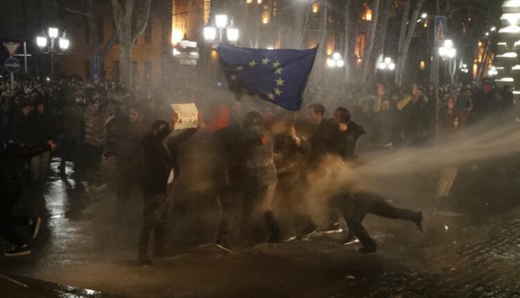 Οι διαδηλωτές κρατούσαν σημαίες της Γεωργίας και της ΕΕ στην κεντρική λεωφόρο Ρουσταβέλι προς το κοινοβούλιο, φωνάζοντας το σύνθημα “Όχι στον ρωσικό νόμο”.