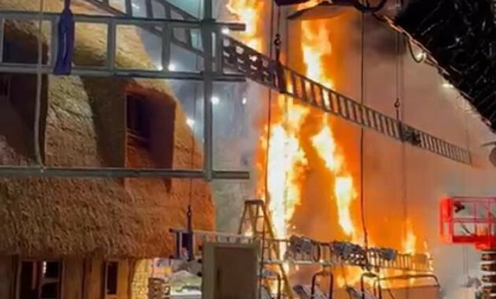 Στις εικόνες φαίνεται ένα ξύλινο σπίτι με ψάθινη στέγη, φώτα και άλλος εξοπλισμός να έχουν τυλιχθεί στις φλόγες.