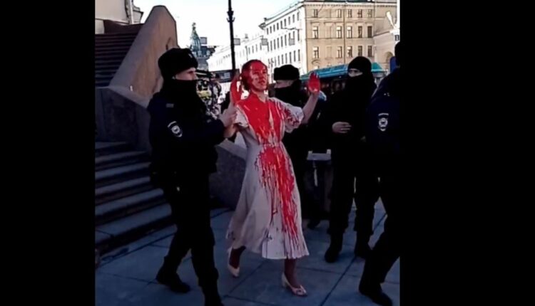 Μια ρωσίδα στην Αγία Πετρούπολη, σε μια συμβολική πράξη στάθηκε στα σκαλιά ενός ιστορικού κτιρίου της πόλης και σε ένδειξη διαμαρτυρίας για τον πόλεμο στην Ουκρανία λούστηκε με κόκκινη μπογιά για να διαμαρτυρηθεί για το αίμα που ρέει στη γειτονική Ουκρανία.