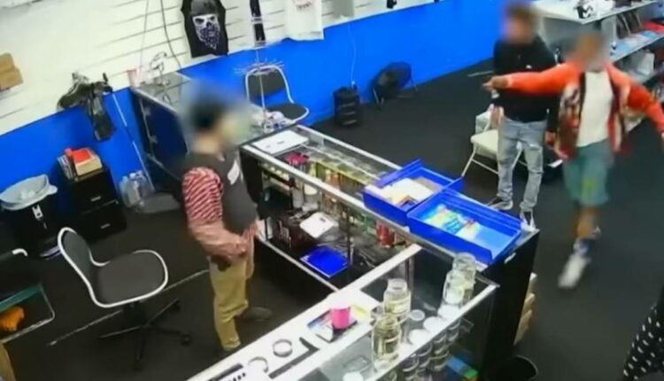 Το βίντεο δείχνει έναν εργαζόμενο σε καπνοπωλείο στην Καλιφόρνια να τραβάει όπλο εναντίον ομάδας επίδοξων ληστών, προκαλώντας μια ανταλλαγή πυροβολισμών με τέσσερις εναντίον ενός, που άφησε ένα άτομο νεκρό.