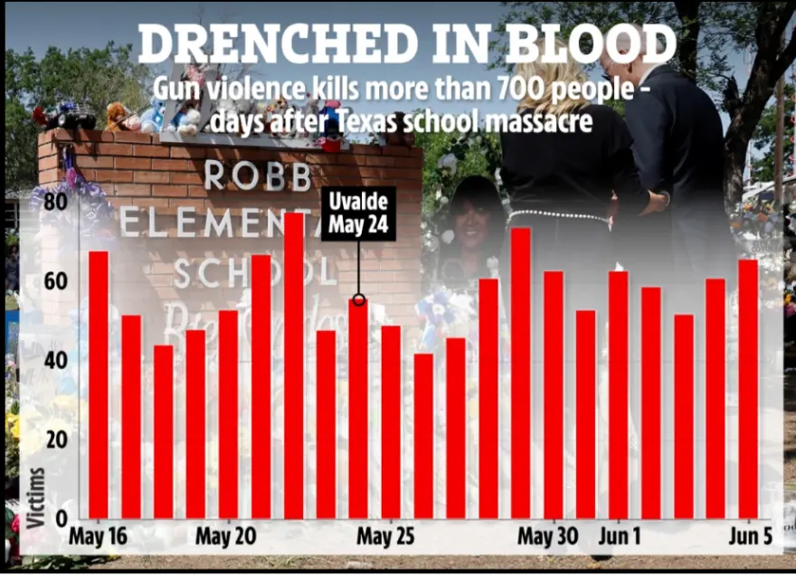 Από τα στοιχεία προκύπτει ότι την ίδια μέρα με την ένοπλη επίθεση στο Ουβάλντε του Τέξας, 56 άνθρωποι σκοτώθηκαν σε ολόκληρη τη χώρα, ενώ την εβδομάδα πριν το μακελειό είχαν σκοτωθεί 390 άνθρωποι. Μάλιστα από τις 24 Μαΐου και μετά ο ημερήσιος αριθμός των θυμάτων ένοπλης βίας δεν έχει πέσει κάτω από 40. Είναι ενδεικτικό ότι στο διάστημα 25 – 31 Μαΐου σκοτώθηκαν 388 άνθρωποι ενώ τις πρώτες πέντε μέρες του Ιουνίου σκοτώθηκαν άλλοι 301.