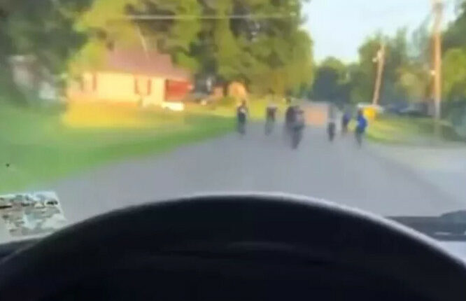 Ένας άνδρας ακούγεται να λέει στο βίντεο: «Ωχ, διάολε, 50 πόντοι», καθώς οδηγεί με κατεύθυνση τα παιδιά που κάνουν ποδήλατο. Επιταχύνει, περνώντας μέσα από την ομάδα και παραλίγο να χτυπήσει ένα από αυτά.