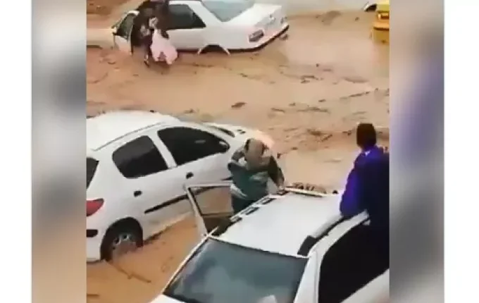 Εικόνες που δημοσιεύτηκαν σε μέσα κοινωνικής δικτύωσης δείχνουν έφηβο καλυμμένο με λάσπη, να έχει γατζωθεί πάνω σε μια κολώνα στη μέση ενός πλημμυρισμένου δρόμου στο Εμαμζαντέχ Νταβούντ. Ένας τοίχος που βρίσκεται κοντά του καταρρέει λίγα λεπτά αργότερα.