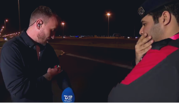 Ακολούθησε ένας διάλογος σε ήπιους τόνους, με τον αστυνομικό να ζητάει να αφαιρεθεί το περιβραχιόνιο και τον Δανό ρεπόρτερ τελικά να υπακούει στη σύσταση.