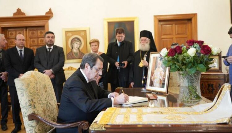 Αμέσως μετέβη στο γραφείο του μακαριστού Αρχιεπισκόπου για να υπογράψει τελευταίος το βιβλίο συλλυπητηρίων για τον θάνατο του Προκαθήμενου της Εκκλησίας της Κύπρου.