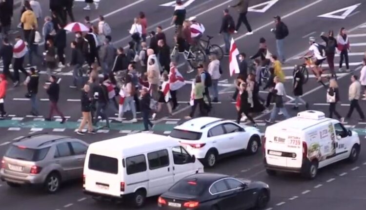 Πολλοί ήταν εκείνοι που συμμετείχαν στην πορεία κρατώντας σημαίες της αντιπολίτευσης στη Λευκορωσία, ενώ τα διερχόμενα αυτοκίνητα κόρναραν, σε ένδειξη αλληλεγγύης.