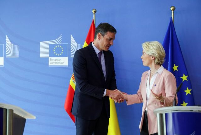 Η πρόεδρος της Κομισιόν και ο πρωθυπουργός της Ισπανίας είχαν πάρει θέση για να κάνουν δηλώσεις στους εκπροσώπους του Τύπου, όταν ξαφνικά ο Σάντσεθ έφυγε από τη θέση και πήγε να παραλάβει κάποια έγγραφα.