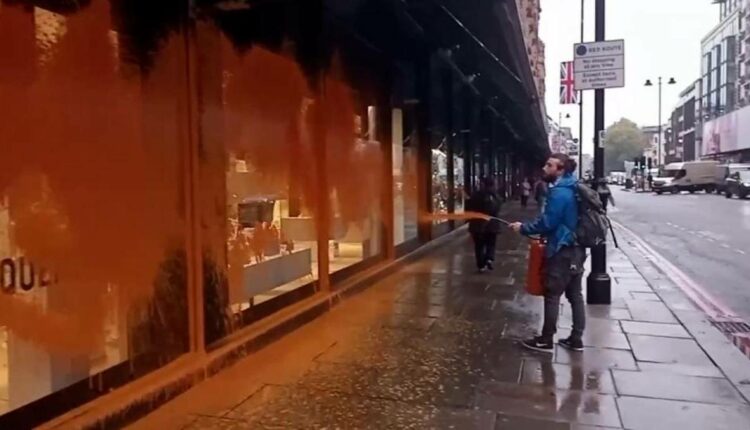 Οικολόγοι ακτιβιστές της οργάνωσης «Just Stop Oil» ψέκασαν με πορτοκαλί χρώμα την πρόσοψη του γνωστού καταστήματος Harrods στο Λονδίνο, ενώ πραγματοποίησαν και καθιστική διαμαρτυρία στον δρόμο.