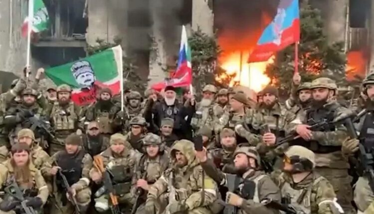 Οι Τσετσένοι του Ραμζάν Καντίροφ, που επιστρατεύτηκαν από τον Βλαντιμίρ Πούτιν για να καταφέρει να κάμψει την αντίσταση των Ουκρανών στην Μαριούπολη, στο βίντεο ποζάρουν σαν αστακοί, κρατώντας σημαίες ενώ από πίσω τους φαίνονται τα ερείπια της ορθόδοξης πόλης.