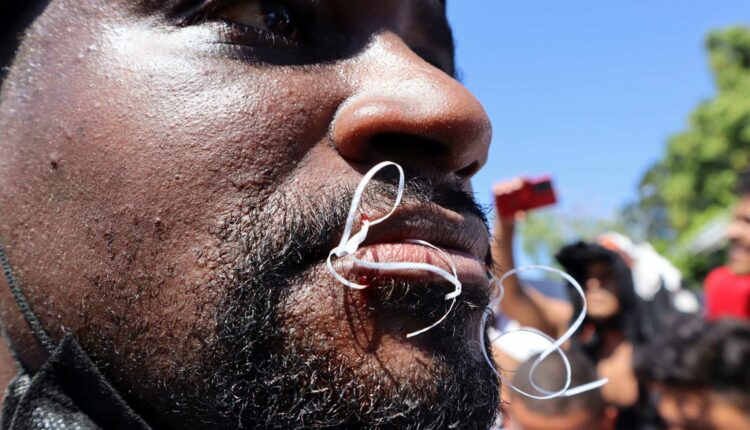 Πάνω από δέκα μετανάστες έραψαν τα στόματά τους χθες Τρίτη (15.2.2022) μπροστά στα τοπικά γραφεία του Εθνικού Ινστιτούτου Μετανάστευσης (INM) στην πόλη Ταπατσούλα, στο νότιο Μεξικό, διαδηλώνοντας για να τους δοθούν χαρτιά ώστε να τους επιτραπεί να πάνε στο βόρειο τμήμα της χώρας, εκεί όπου είναι τα σύνορα με τις ΗΠΑ.