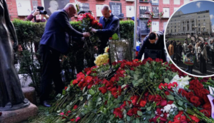 Κάτω από το πολεμοχαρές πανό με τα σύμβολα της ρωσικής εισβολής στην Ουκρανίαςστήθηκε το ποτάμι των Μοσχοβιτών που πήγαν να αποχαιρετήσουν τον τελευταίο ηγέτη της Σοβιετικής Ένωσης.