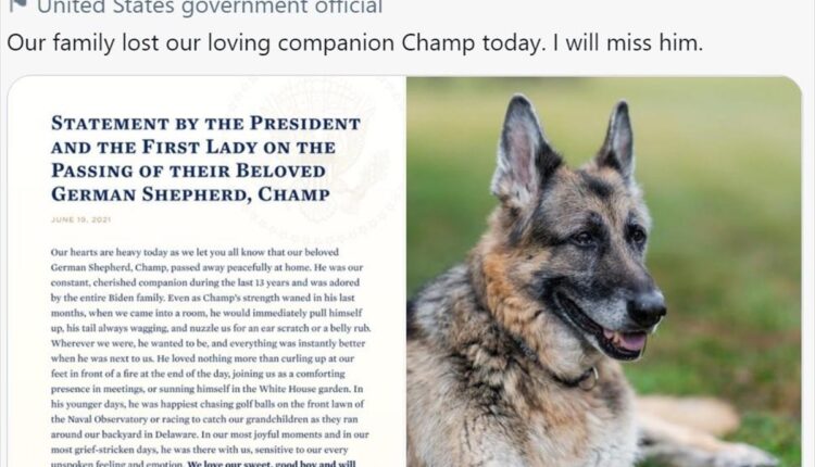 Ο πρόεδρος Τζο Μπάιντεν και η Πρώτη Κυρία Τζιλ Μπάιντεν ανήγγειλαν τον θάνατο του σκύλου τους Τσαμπ, «μόνιμου και αγαπημένου συντρόφου» επί 13 χρόνια.