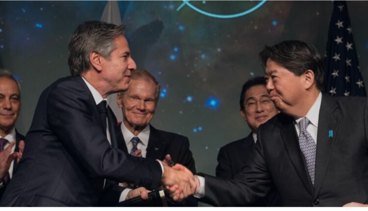 Ο υπουργός Εξωτερικών των ΗΠΑ Άντονι Μπλίνκεν και ο ομόλογός του της Ιαπωνίας Χαγιάσι Γιοσιμάσα υπέγραψαν τη συμφωνία εκ μέρους των Ηνωμένων Πολιτειών και της Ιαπωνίας, αντίστοιχα.