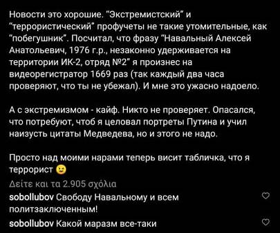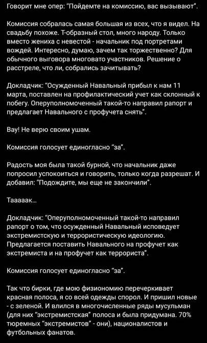 «Απλά τώρα υπάρχει μια ένδειξη πάνω από την κουκέτα μου ότι είμαι τρομοκράτης», ανέφερε ο Ναβάλνι σε ανάρτηση, που δημοσιεύθηκε με τη βοήθεια των δικηγόρων του.