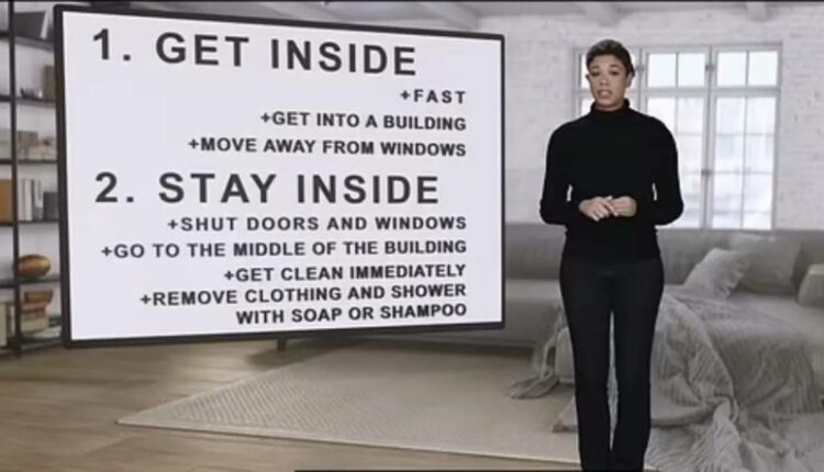 Στη συνέχεια, τους προτρέπει να ακολουθήσουν τρία απλά βήματα , όπως «να μπουν μέσα, να παραμείνουν στο σπίτι και να ενημερωθούν μέσω της τηλεόρασης για το τι πρέπει να κάνουν στη συνέχεια». Στο σχετικό βίντεο, ο εκπρόσωπος των αρχών ακούγεται να λέει ότι, «το να μείνετε στο αυτοκίνητο δεν είναι επιλογή» και προσθέτει ότι «δεν πρέπει να βγουν έξω μέχρι οι αξιωματούχοι να πουν ότι είναι ασφαλές».