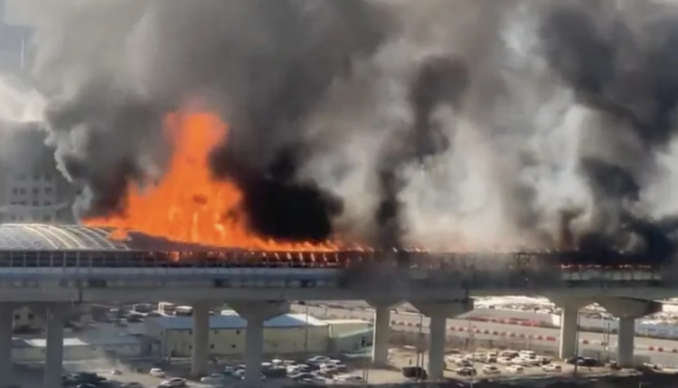 Σε εικόνες που μεταδόθηκαν από μέσα ενημέρωσης και κοινωνικής δικτύωσης, φαίνεται το σκεπαστό τμήμα του υπέργειου αυτοκινητοδρόμου -το οποίο καλύπτεται από ειδική ηχομονωτική κατασκευή προκειμένου να προστατεύονται τα γειτονικά κτίρια από τον θόρυβο της κίνησης των οχημάτων- να έχει τυλιχθεί στις φλόγες.