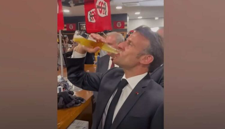 Ο Εμανουέλ Μακρόν απαθανατίστηκε από τις κάμερες του Canal + με μια Corona στο χέρι, να πίνει στην υγεία των παικτών της Τουλούζ.