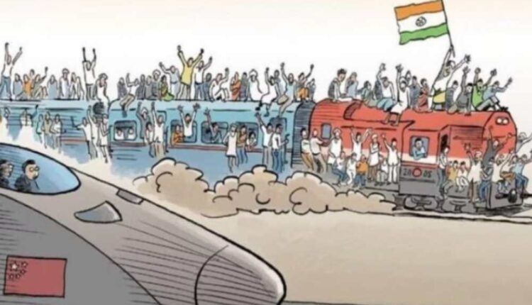 Η γελοιογραφία δείχνει ένα ινδικό τρένο, το οποίο ξεχειλίζει από επιβάτες τόσο μέσα όσο και πάνω στα βαγόνια, να προσπερνά ένα κινεζικό τρένο σε μια παράλληλη γραμμή.