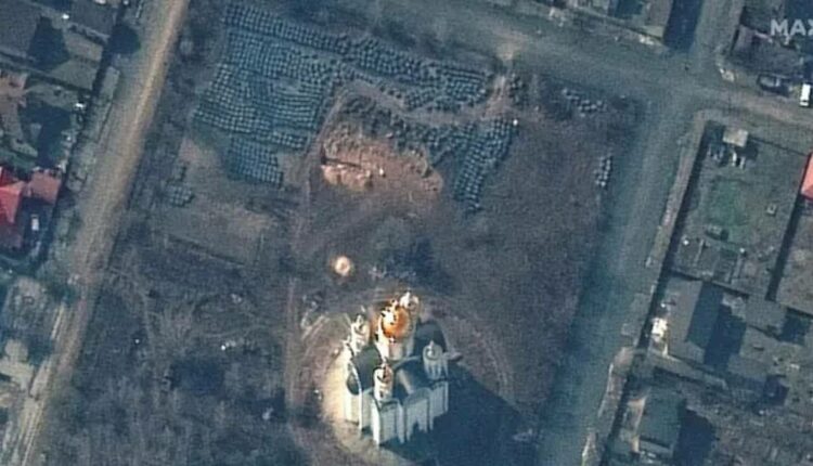 Η Maxar Technologies, η οποία συλλέγει και δημοσιεύει δορυφορικές εικόνες από την Ουκρανία, τόνισε ότι τα πρώτα σημάδια ανασκαφής για ομαδικό τάφο στην εκκλησία του Αγίου Ανδρέα και του Πιερβοζβάνοχο των Αγίων Πάντων έγιναν ορατά στις 10 Μαρτίου.